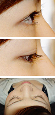 アイメイクの演出が引き立ち、 マスカラをつけることによって一層目元がパッチリします。 洗顔後も、まつ毛はカールを持続しています。 当サロンのパーマ液は、ジェル状のものを使用していますので、施術中にパーマ液が流れにくく、目にしみません。 毛先が縮れることなく、月日が経ってパーマが取れかかった時も、まつ毛 のバラつきがなく、全体が自然に落ちていきますので、見ためが綺麗です。